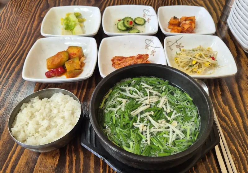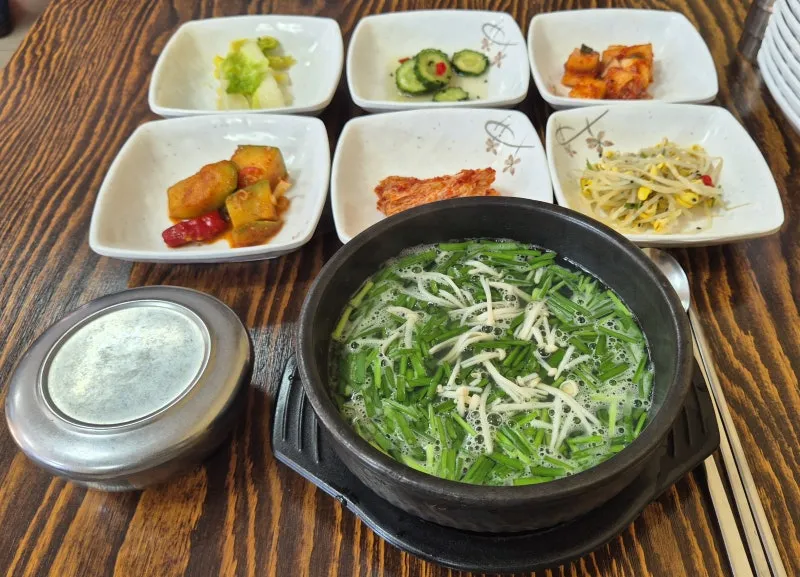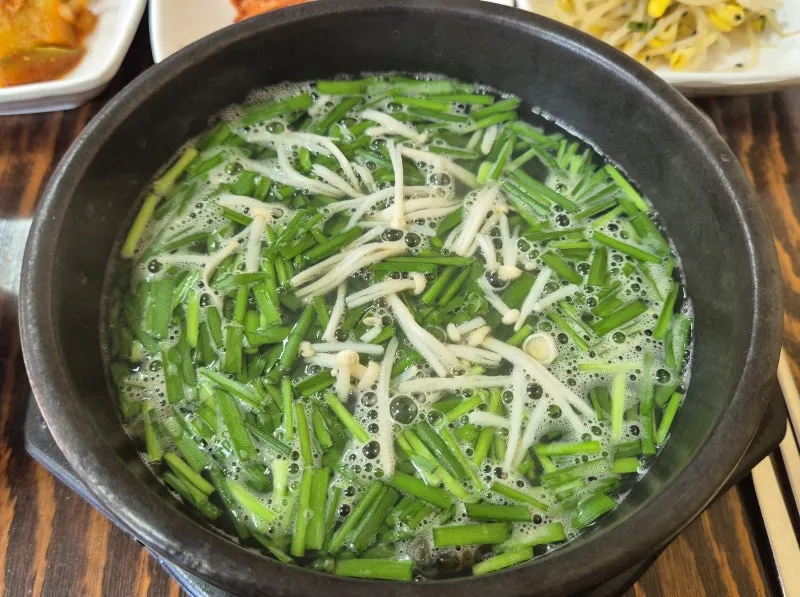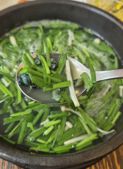 부추가 가득한 뚝배기인데요. 다슬기는 아래에 깔려 있어 수저로 확인해보니 통통한 다슬기가 보이네요.