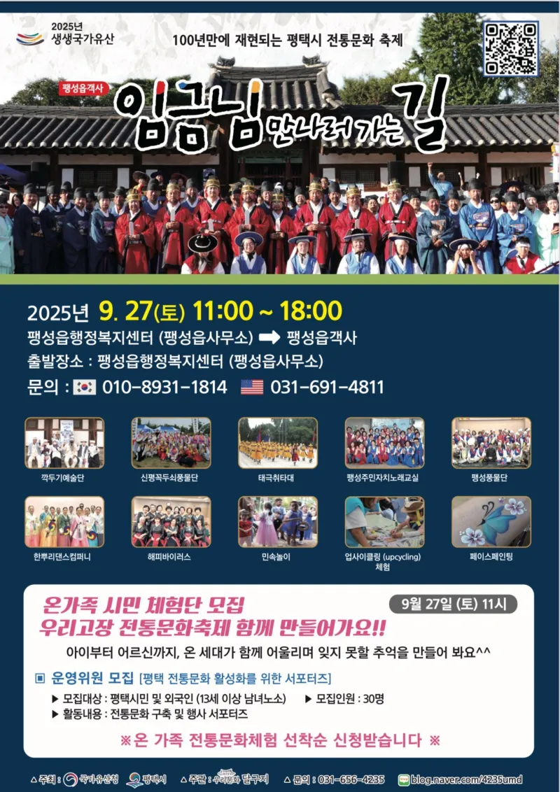 국가유산청과 평택시가 주최하고 우리문화달구지가 주관하고 있는, 팽성읍 객사를 재 발견하고 문화적으로 활용하는 생생국가유산 프로젝트 입니다. ✨ 임금님 만나러 가는 길 ✨ 한미가 함께하는 주민 주도적 참여 형으로 진행되는 [임금님 만나러 가는 길] 전통문화 축제는 옛 팽성현의 현감이 한양에 계신 임금님께 예를 올렸던 행사로서 주민과 함께 100년 만에 재현되는 평택시의 대표적 전통문화 축제입니다. 이에 현감행렬 (시민퍼레이드) 및 망궐례 재현 행사에 무료 체험 하실 분들의 접수를 받고 있습니다 일시 : 2025년 9월 27일(토) 1...