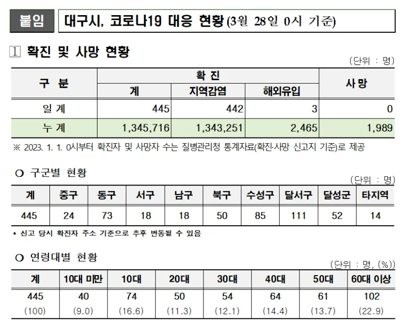 ○ 질병관리청 발표 3월 28일 오전 0시 현재, 대구시에서 발생한 코로나19 신규 확진환자는 445명(지역감염 442, 해외유입 3)으로 총 확진자 수는 1,345,716명(지역감염 1,343,251, 해외유입 2,465)입니다.