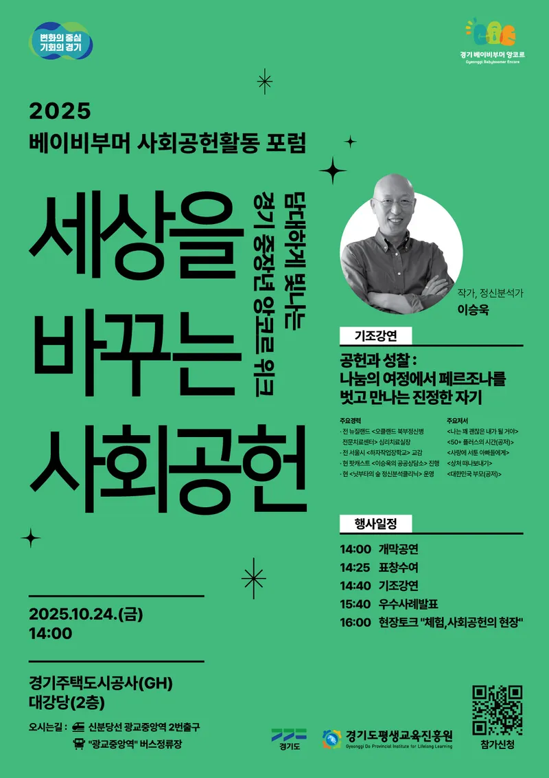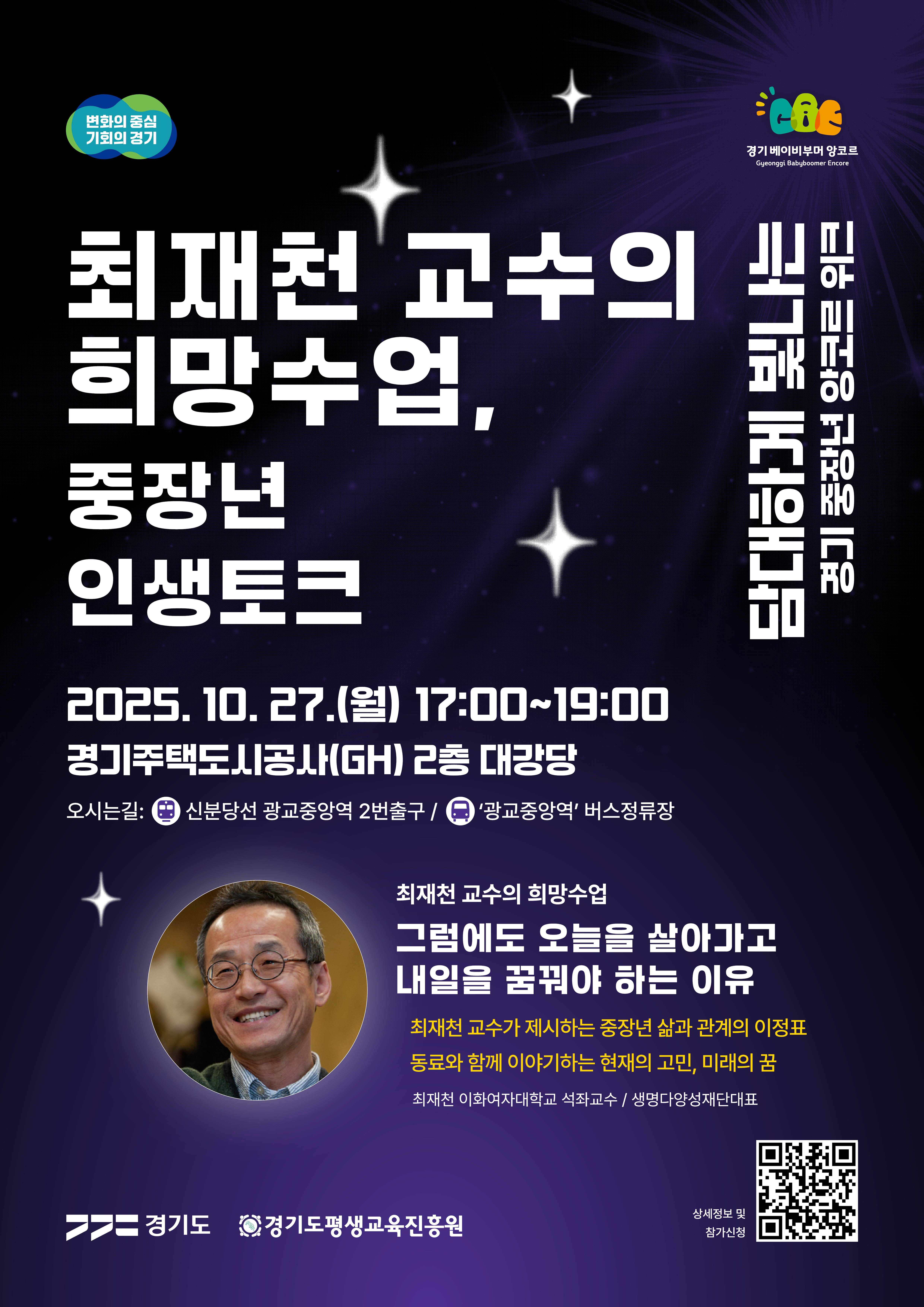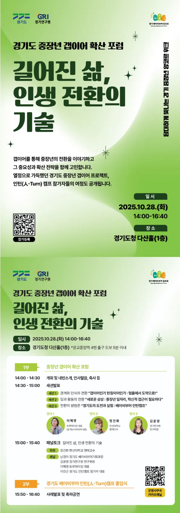 안녕하세요, 경기도 베이비부머 인턴(人-Turn)캠프 운영사무국입니다. 본 과정은 베이비부머 세대들이 스스로의 삶을 재설계하고, 새로운 환경에서 색다른 경험과 기회를 탐색해 보는 중장년 갭이어(Gap year) 프로그램으로써, 약 3개월간의 여정이 공개 될 예정입니다. "경기도의 도전, 인턴캠프와 중장년 갭이어"에 관심 있으신 모든 분들을 초대합니다! 📣제출된 정보는 프로그램 운영 외 용도로 절대 사용되지 않습니다. * 일시/장소: 2025.10.28(화) 14:00~16:40 / 경기도청 다산홀 1층 * 주최/주관: 경기도, 경...