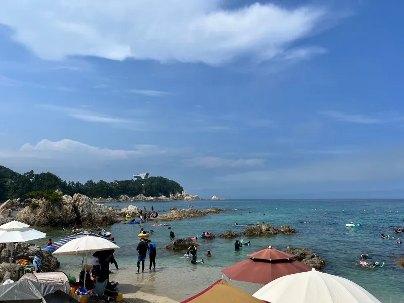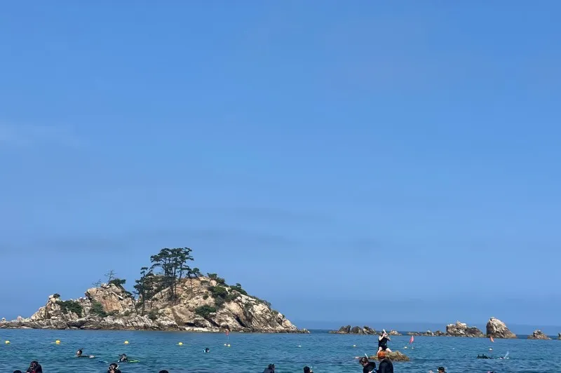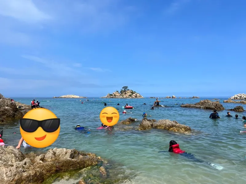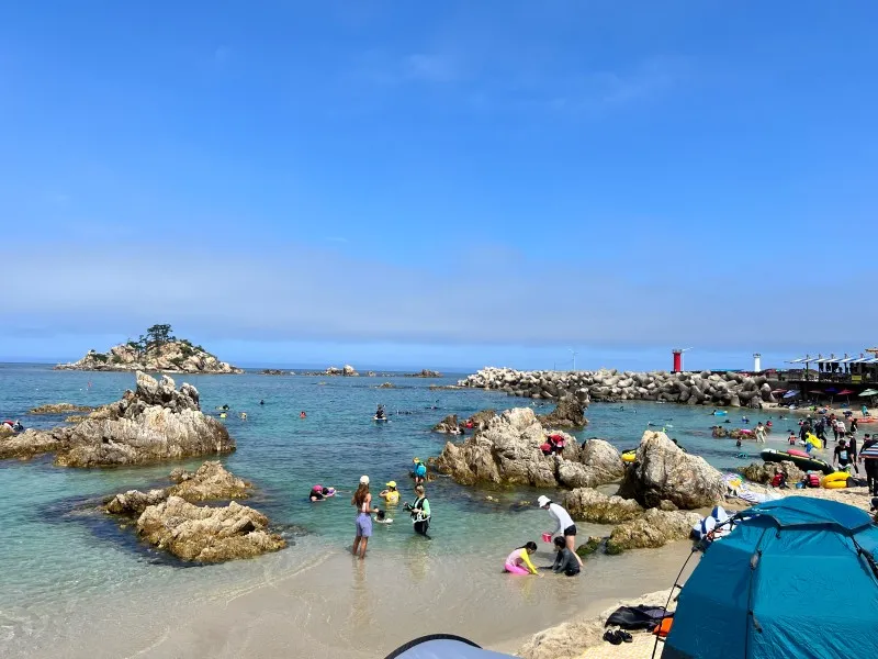 사방을 둘러봐도 낮고 맑은 바다에 사람들이 즐거운 시간을 보내고 있습니다.