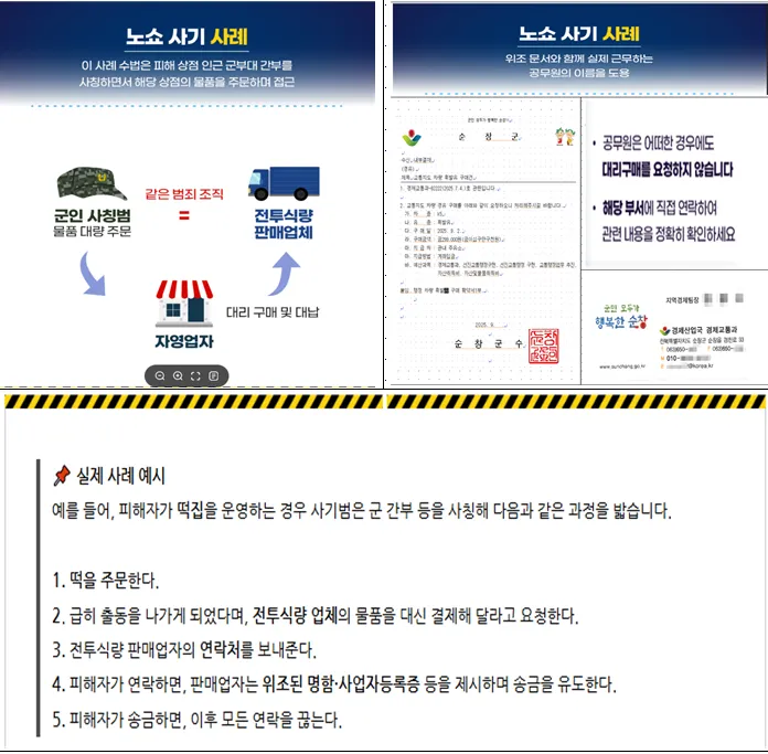 공무원·군인·경찰·소방관 등 관공서를 사칭하여 자영업자 및 소상공인들을 대상으로 물품구입등 대량 주문을 넣고 업체 알선을 통한 선금요구 또는 대리 구매 등 신종 사기수법입니다.