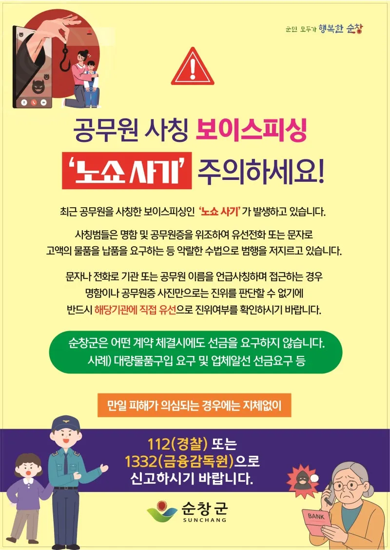 순창군 관계자는 “순창군 공무원은 어떤 계약체결 시에도 선금을 요구하지 않는다”며 반드시 유선전화로 사실여부를 확인이 필요하다고 당부드립니다.