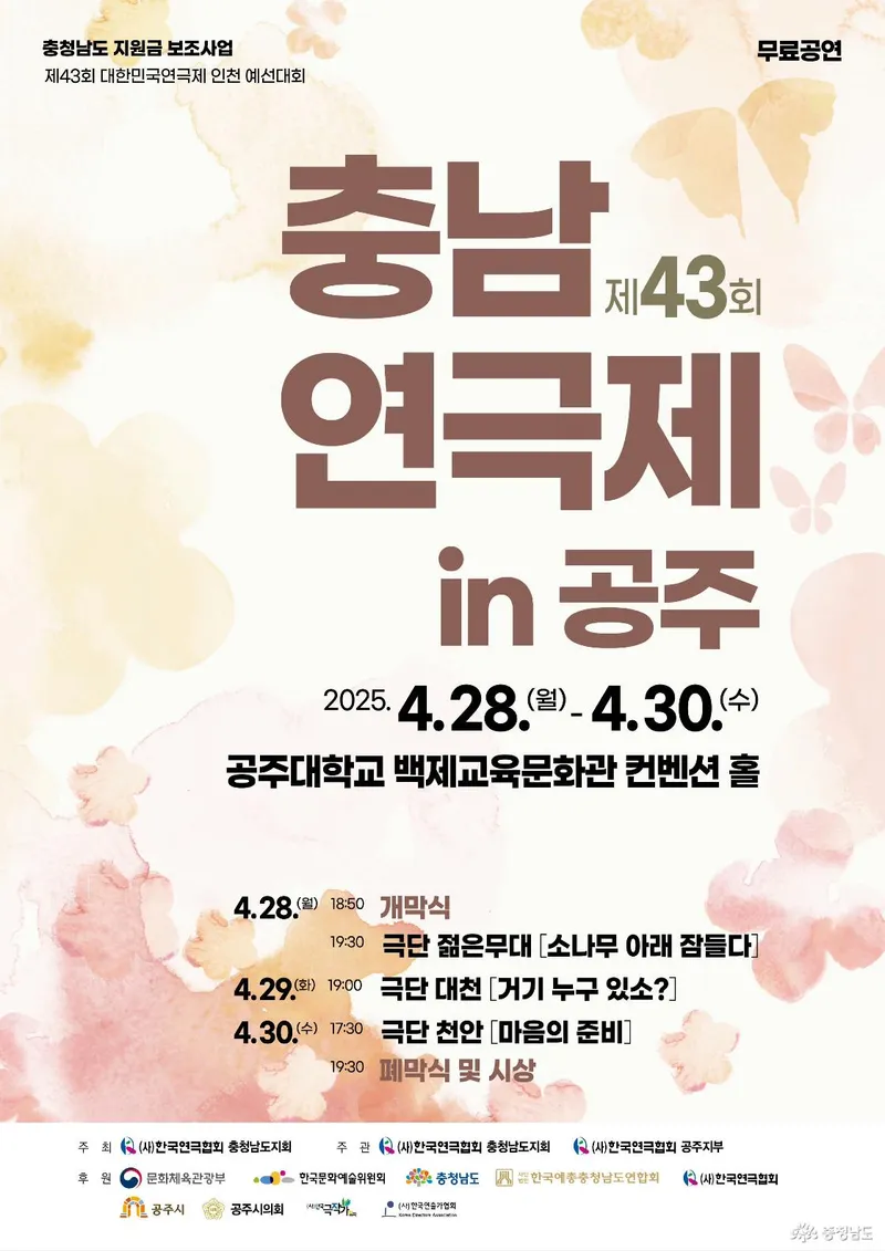 충남 연극인들의 뜨거운 열정과 다채로운 이야기가 펼쳐질 제43회 충남연극제가 오는 4월 28일(월)부터 30일(수)까지 3일간 공주에서 개최됩니다.