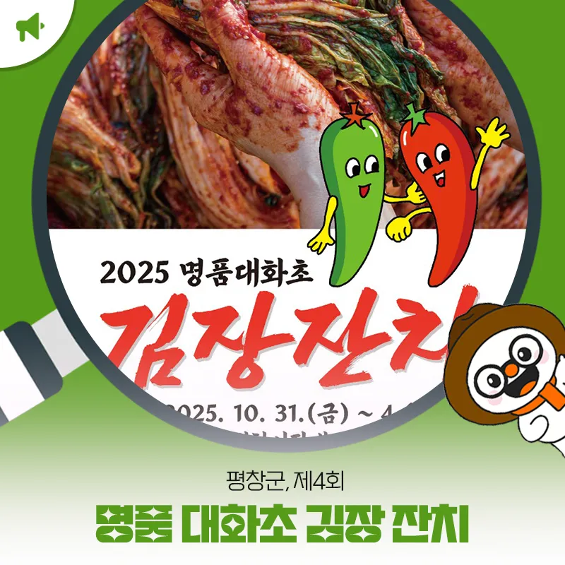 📍10월 31일부터 11월 4일까지 대화면 대화 별다방 앞에서 ‘제4회 명품대화초 김장 잔치’가 열립니다. 명품대화초김장잔치위원회(위원장 권명식․마영희)가 주최하는 명품 대화초 김장 잔치는 해발 700m의 일교차와 지리적 특성으로 단맛이 강한 평창군 고랭지 배추와 매콤 아삭한 명품 대화초를 사용하여 체험객들의 높은 호응을 받고 있습니다.