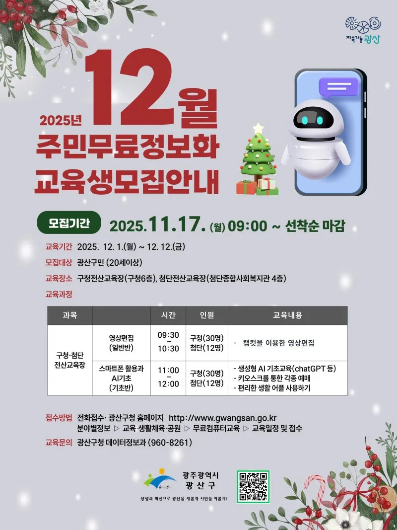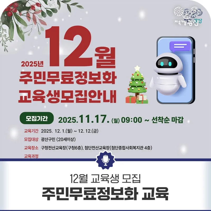 ✅ 신청방법: 광산구 홈페이지 > 분야별정보 > 교육·생활체육·공원 > 무료컴퓨터교육 > 교육일정 및 접수