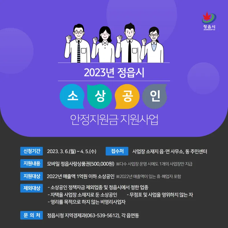 ▶ 관련문의 : 정읍시청 지역경제과 소상공인지원팀 (☎539-5612) 및 읍·면사무소, 동주민센터