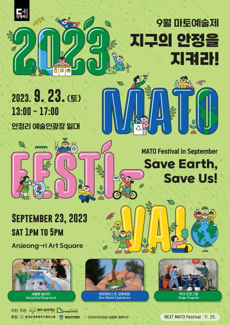 평택시문화재단은 평택시민과 거주 외국인을 아우르는 안정리 대표 문화예술 축제 육성을 위해 [9월 마토예술제: 지구의 안정을 지켜라!] 행사를 개최합니다.