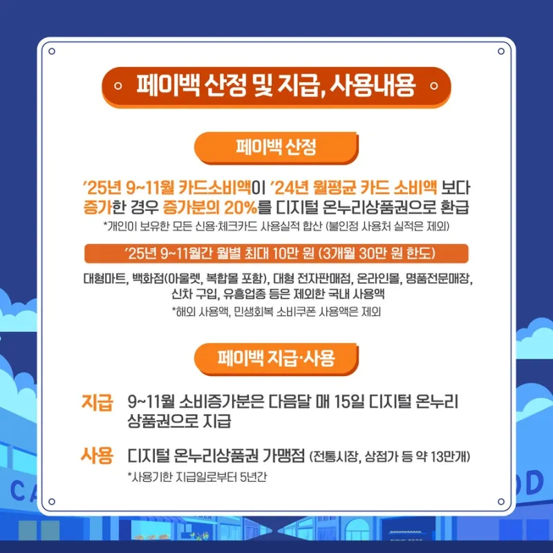 2025년 9~11월 카드 소비액이 2024년 월평균 카드 소비액보다 증가한 경우, 증가분의 20%를 디지털 온누리상품권으로 환급 ※ 개인이 보유한 모든 신용·체크카드 사용 실적 합산 (불인정 사용처 실적 제외) |