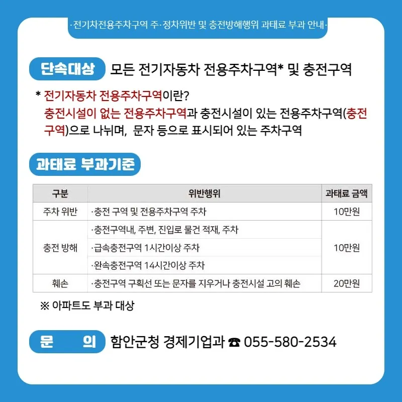 전기차 전용주차구역 및 충전구역 내 주·정차위반 및 충전방해행위 과태료 부과 안내