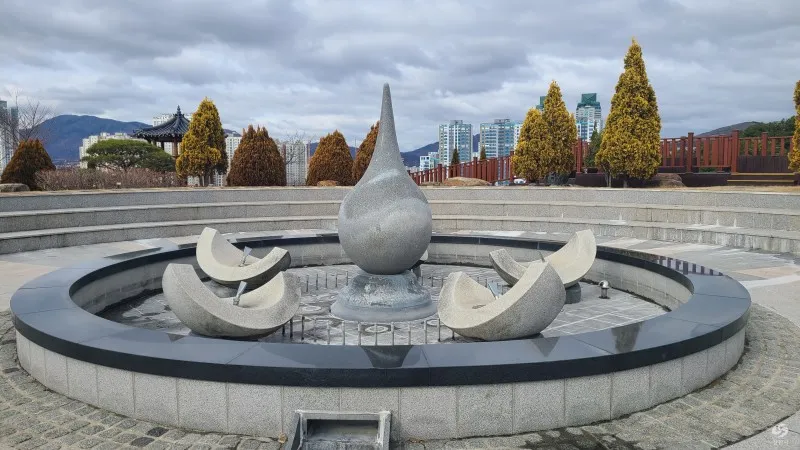 계단이 끝나는 곳에는 물방울처럼 생긴 분수대가 있고, 왼편 아래쪽으로는 도토리원으로 향하는 나무데크계단이 있답니다.