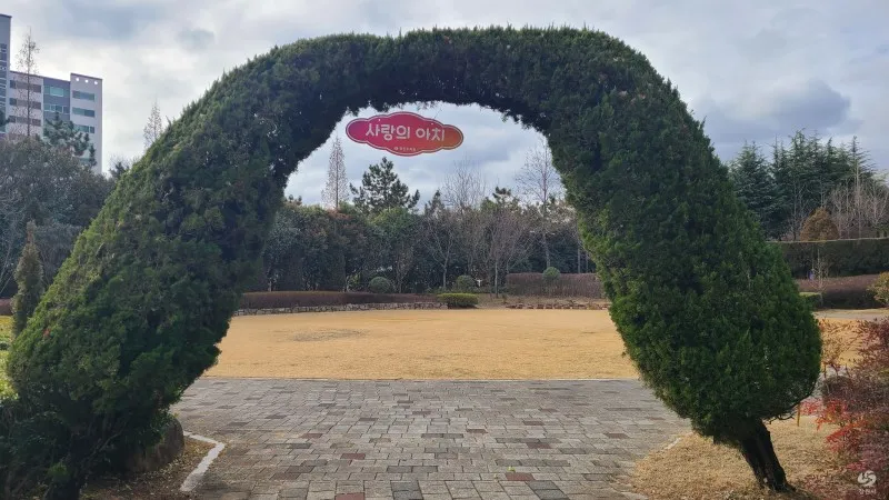 맨발로 잔디밭에 산책 가능한 맨발의 숲 입구에는 사랑의 아치 나무가 포토존이랍니다.