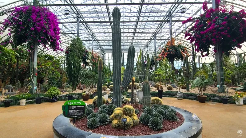 선인장 온실 중앙으로 선인장이 멋지게 자라고 있으며 키 큰 나무에 화려한 핑크빛 아열대 꽃이 피어 있어 분위기가 환해지네요.