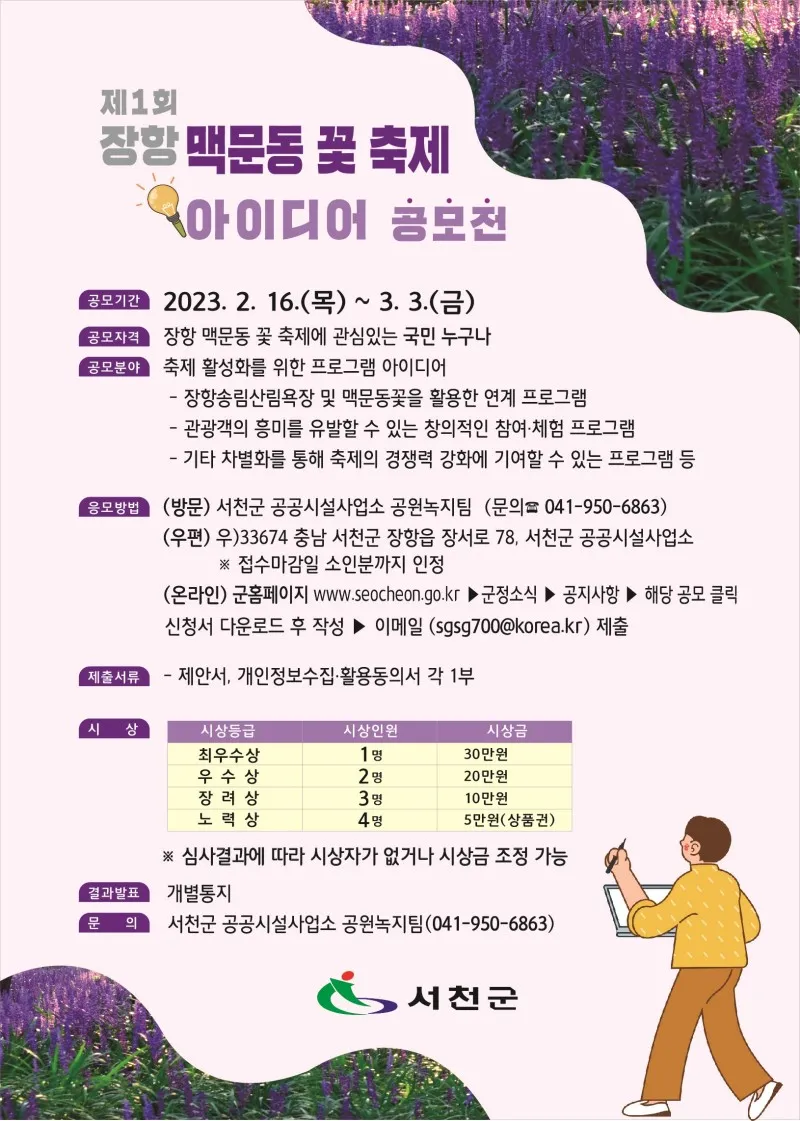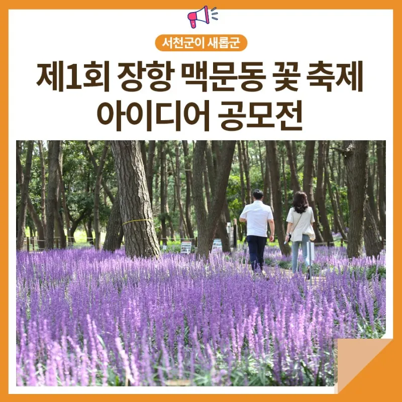 2023년 새롭게 시작하는 『제1회 장항 맥문동 꽃 축제』가 많은 주민에게 감동과 재미를 선사하고, 함께 만들어가는 축제문화 조성에 앞장서고자 창의적이고 다양한 아이디어를 다음과 같이 공모합니다!