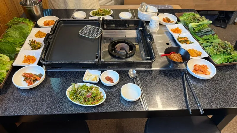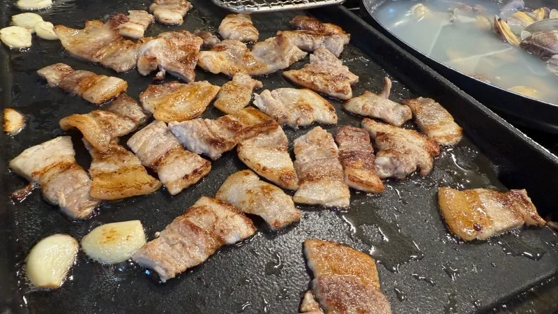 삼겹살+다채로운 쌈채소+ 시원한 바지락탕 까지