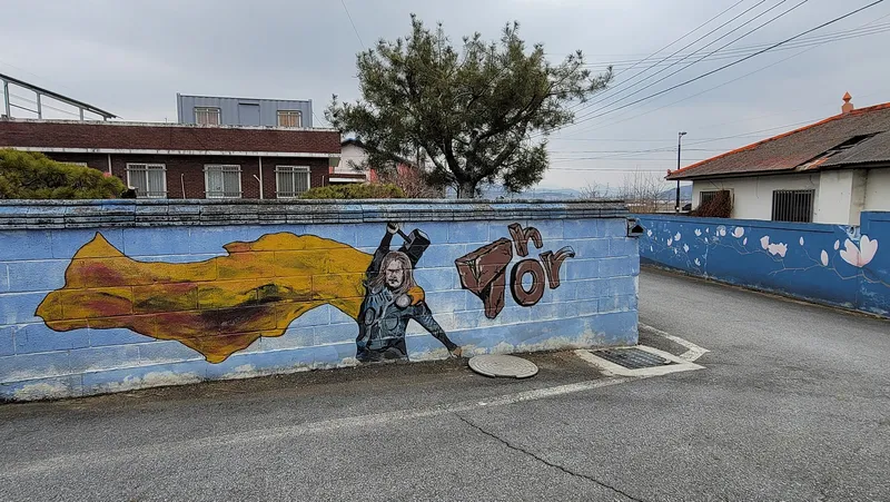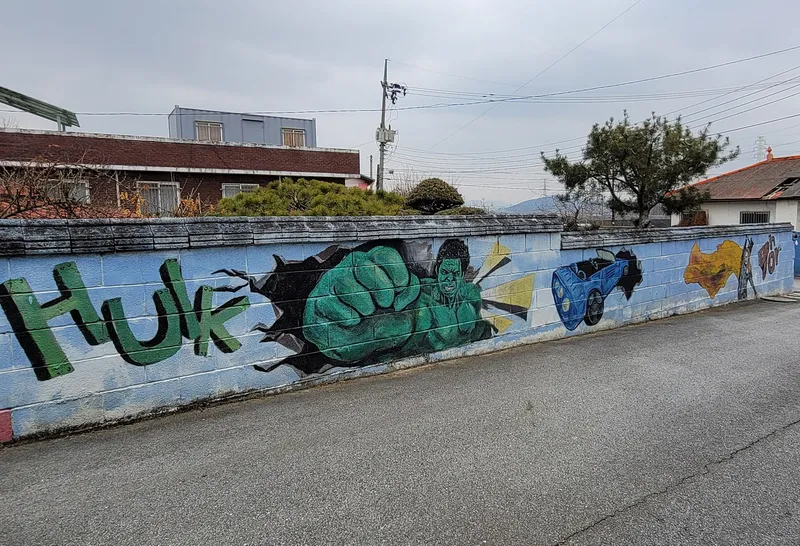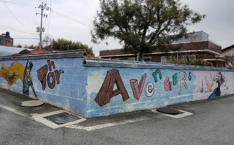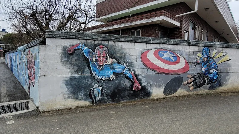 솟대를 가득 그려놓아 마을의 안녕을 비는 담장도 있고, 어떤 집은 둘레 담을 돌아가며 어벤저스 주인공들이 집을 지키는 모습입니다. 이 집에는 어벤저스 외에 집을 지키는 강아지가 담장 밖의 인기척에도 맹렬하게 짖어대는군요.