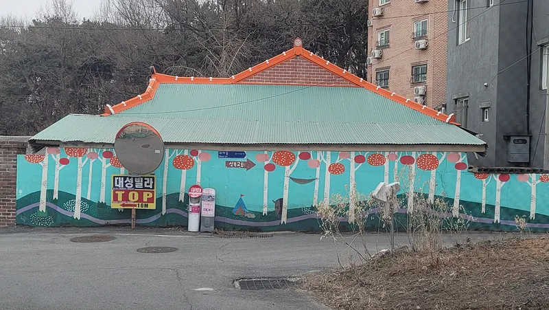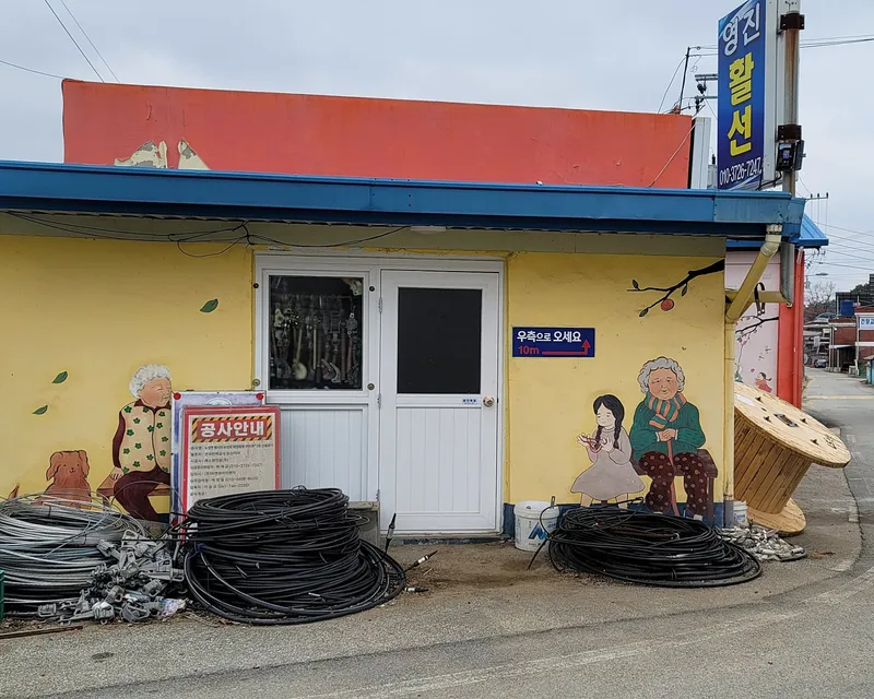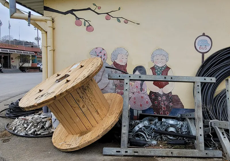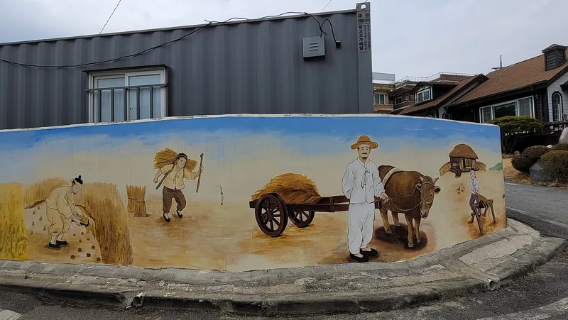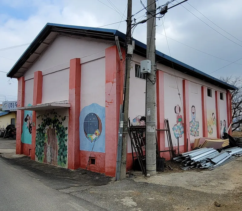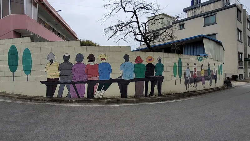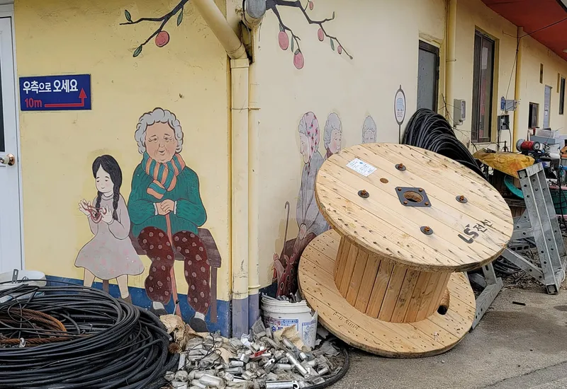 마을 창고 같은 곳에도 밝게 웃는 그림을 볼 수 있고, 옆에 있는 작은 집 벽에는 할머니가 손녀를 데리고 앉아 있는 모습, 버스 정류장에서 나란히 앉아 이야기를 나누는 할머니들의 모습도 있습니다. 벽화에서 할머니들의 웃음소리가 나오는 것 같습니다.