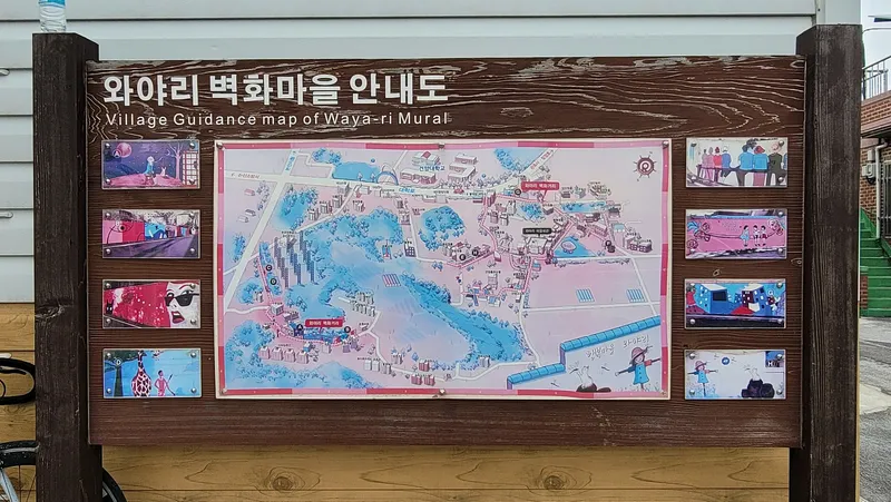할머니 벽화 건너편에는 와야리 마을회관 겸 노인회관이 있고 옆에는 와야리 마을벽화 안내도도 있습니다.
