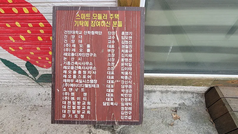 이 집은 한 칸으로 보이는 작은 모듈러 주택이고, 집 앞에는 이 집을 만드는데 힘을 보탠 분들의 명단이 있습니다.