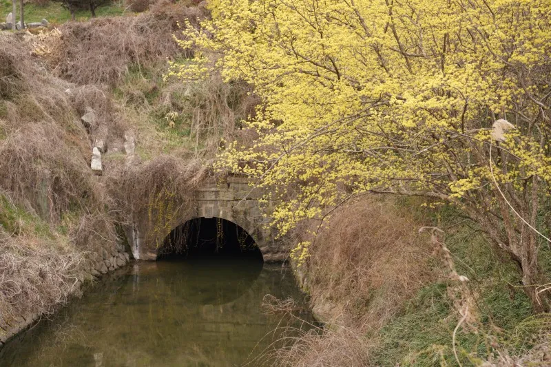 비비정 아래로 수로가 지나고 있는데요. 만경강 물을 농업용으로 사용하기 위해 만든 수로입니다. 지금은 그 기능을 멈추고 옛 기억만 간직하고 있습니다. 수로 주변에도 노란 산수유꽃이 환하게 피었습니다.