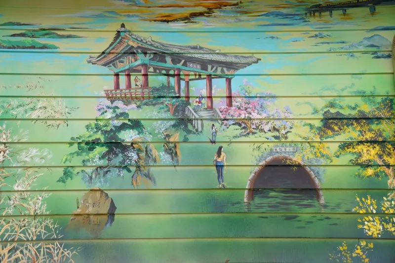 만경강 제방길을 걷다가 수로를 건너면 비비정마을로 이어집니다. 작은 마을에 집들이 옹기종기 모여 있습니다. 마을 골목을 따라 걷다 보면 벽화를 볼 수 있습니다. 비비정의 특징을 그림으로 잘 남겨놓았습니다.