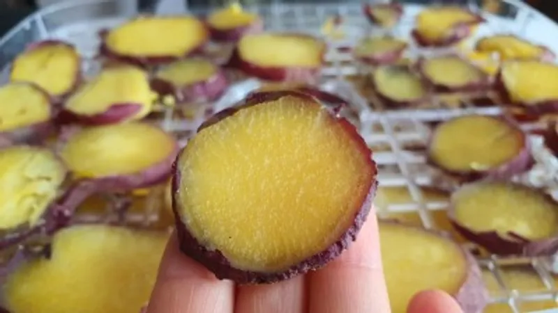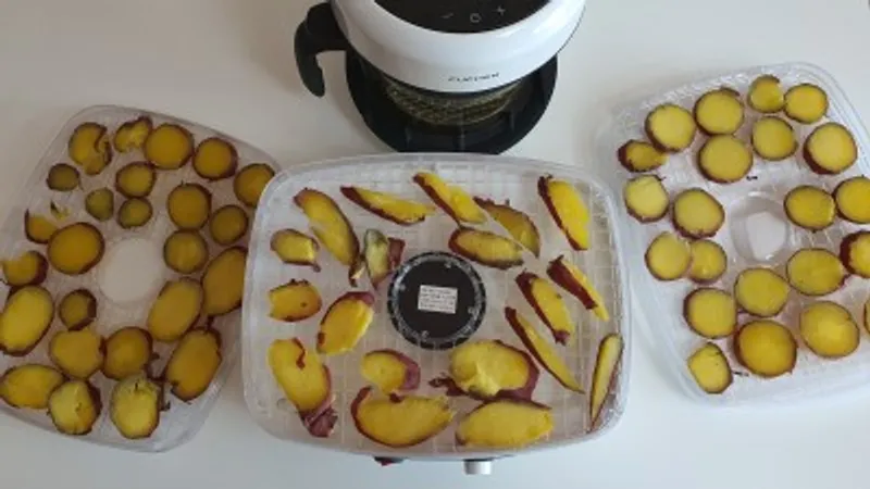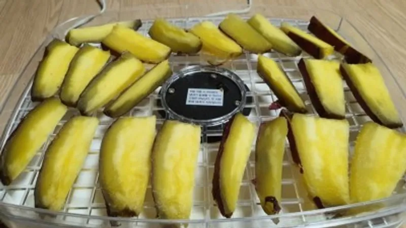 보통 저녁에 식품건조기 전원을 켜두면 다음 날 아침 이른 시간에 거의 완성되어 있는데 건조 후에는 고구마의 샛노란 색상이 더 진해져 맛있어 보인답니다.