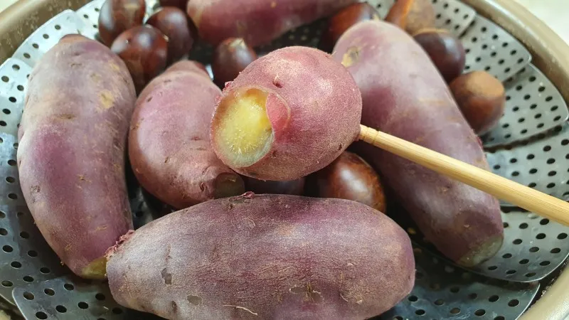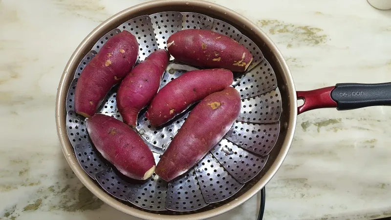 적당한 크기의 고구마를 골라 삼발이에 올려 쪄냅니다. 고구마 6개를 건조하기 쉽게 얇게 썰어내면 식품건조기 3단이 가득 차게 되는데요. 한 번에 너무 많은 양을 찌면 건조가 어려우므로 건조기 용량을 가늠하여 고구마 개수를 정해주어야 합니다.