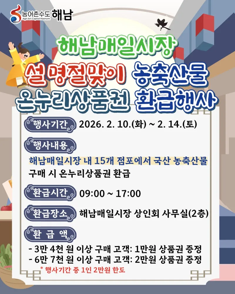 🎉해남매일시장에서 국산 농축산물 구매하고 온누리상품권 환급 혜택 받으세요!🥕🍗