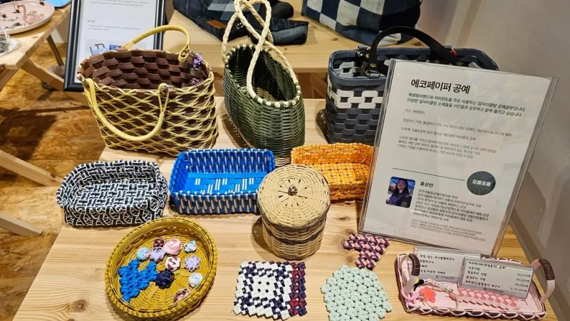 에코페이퍼 공예로 만든 창살무늬 가방, 물결무늬 가방, X자 장식 트레이, 티매트 등 다양한 작품들도 볼 수 있었습니다.