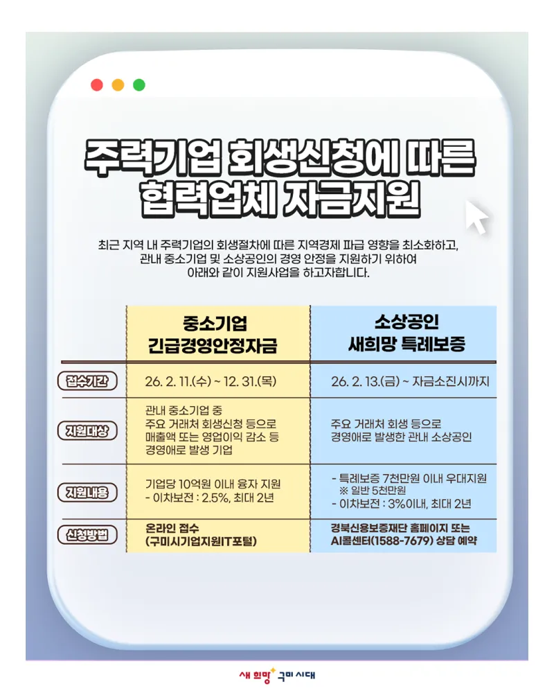 - 소상공인 새희망 특례보증 : 경북신용보증재단 홈페이지 또는