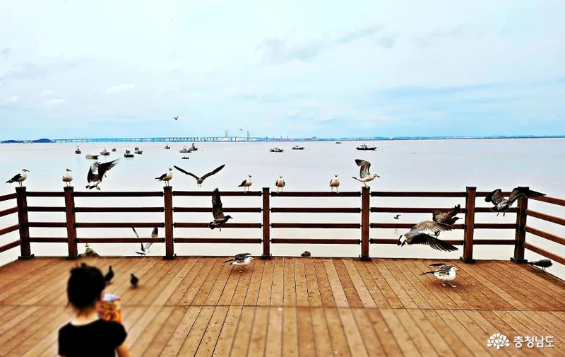전망대 데크길의 과자를 든 소녀 앞으로 새들이 한가득 몰려 있다. 바다이니 당연히 갈매기떼려니 했는데가까이 다가가니 갈매기와 비둘기가 섞여 있다. 이런 특이한 광경은 처음이다. 소녀의 과자 부스러기 앞으로 갈매기와 비둘기 모두가 모여 들었다.
