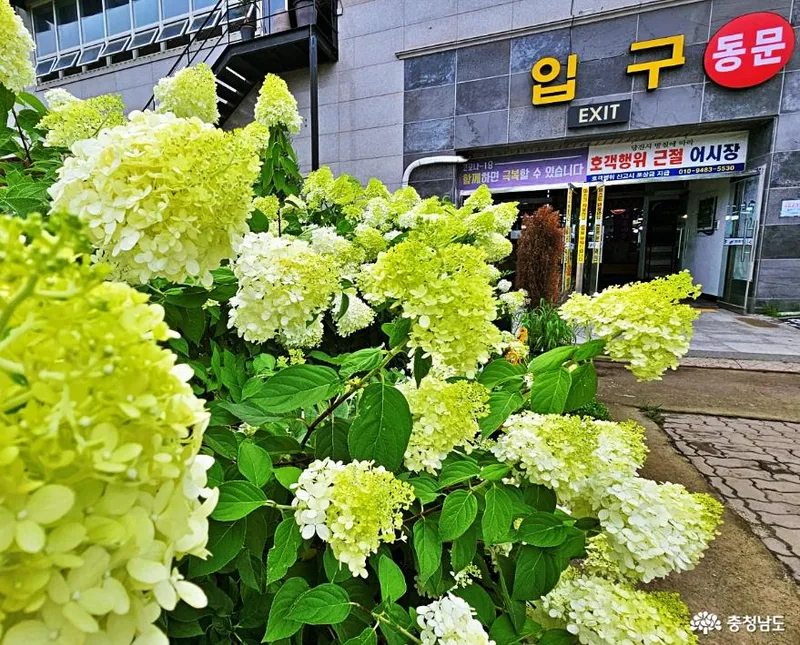 어시장 입구에 소담스럽게 수국이 피어 있다.