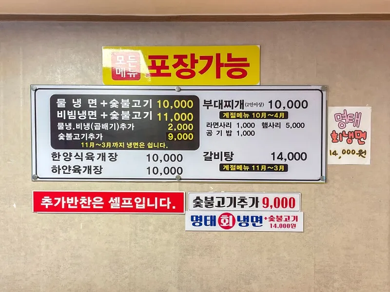 메뉴는 냉면, 한양식 육개장, 하얀 육개장, 부대찌개, 갈비탕까지 있어서