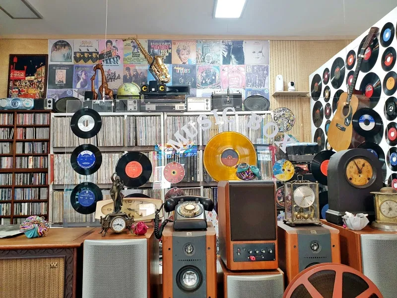 그중에는 청양군의 근현대사 유물 옛 사진이 전시된 골목 음악다방도 있었습니다. 매주 화요일 ~ 토요일 오후 1시부터 9시까지 무료로 운영됩니다. 벽면을 따라 많은 레코드판과 유물이 전시되고 홀 한가운데로는 테이블과 의자로 꾸며졌습니다. 주변 가게나 카페에서 음료 등을 구매하여서는 편안하게 음악을 들으며 근현대사 유물과 옛 사진 등을 감상합니다.