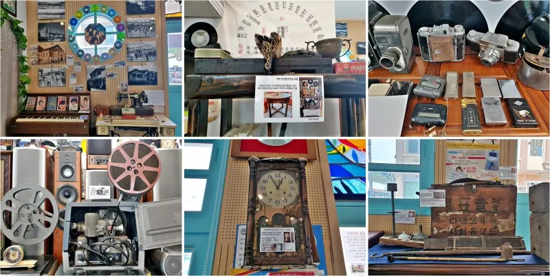 마이클 잭슨, 웸,스모키, 권인하, 강인원, 신형원, 김현식 등 70~ 80 감성의 팝과 대중가요 레코드판이 벽면을 가득 채웠고 전쟁영화 속에서 늘 병사가 애인이나 가족사진을 끼워두고 다니는 모습을 보여주던 소품 지포라이터가 설명과 함께 전시됩니다. 청파 한상필 선생의 탁자와 서예용품의 유품 옛 차부에 있었던 시계와 기둥 일부도 보존되네요. 옛 음악을 들으며 유물을 감상하다 보니 시간이 하염없이 흘렀습니다. 나가는 길에는 단돈 1천 원의 인생 네 컷도 담아보세요.