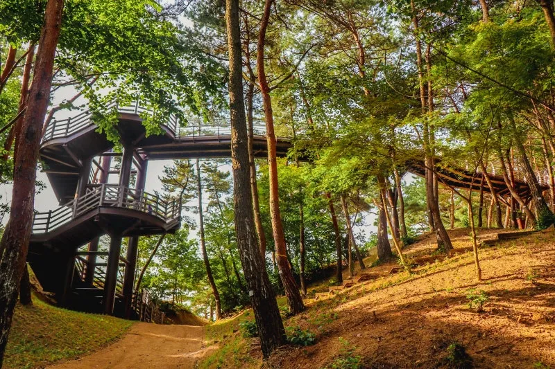 흥주사 소나무 숲의 맥문동 군락지를 지나 만날 수 있는 백화산 트리워크는 빽빽한 소나무 숲 사이를 편안한 데크길로 돌아볼 수 있는 숲속 공중 산책로로 백화산의 아름다운 소나무 숲을 가볍게 맛볼 수 있어 한적하게 산책하기 좋답니다.