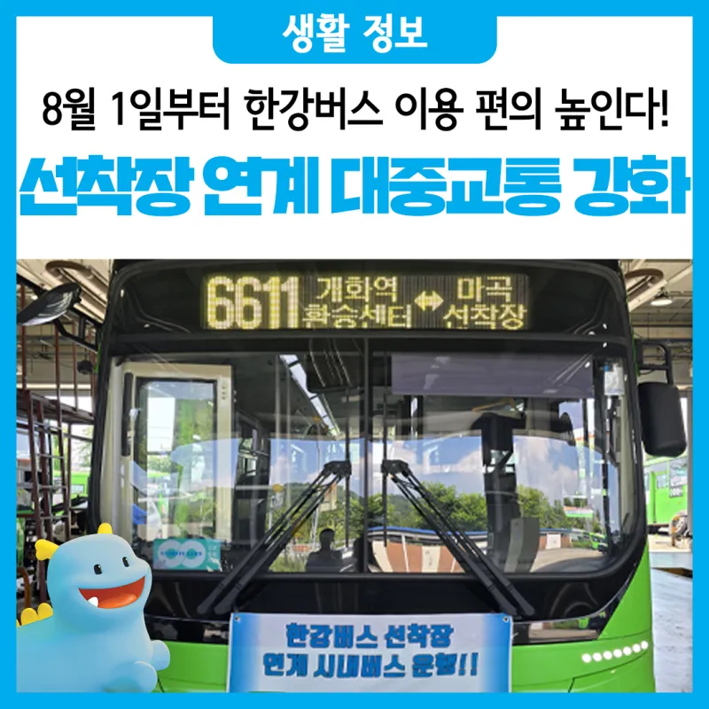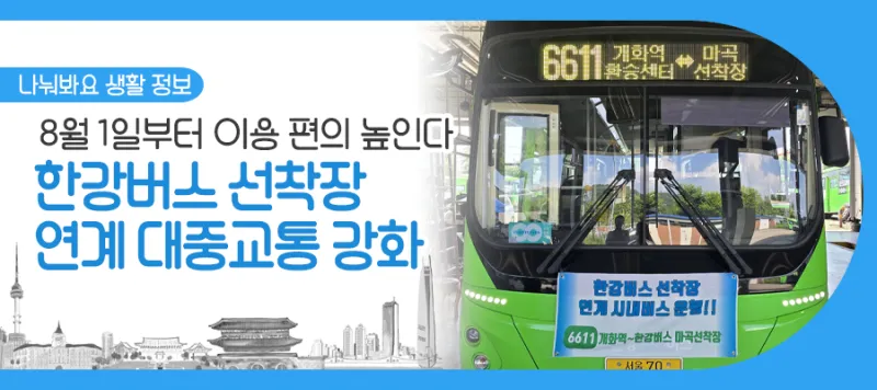 - 마곡, 망원, 압구정, 잠실 4개 한강버스 선착장과 시내·마을버스 8개 노선 연결 후 8월 1일부터 운행 * 8개 노선 중 마곡·망원 선착장 경유 3개 노선 신설, 망원·압구정· 잠실 선착장 5개 노선 일부 조정 - 망원 선착장, 상암월드컵파크를 잇는 8775번, 평일 출퇴근 시간에만 운행되는 맞춤 버스로 투입 - 연계성을 높이고 효율적인 운영을 위해 한강버스 운항 개시 전 버스 운행 시작, 각 노선별 수요와 운행 시간 등을 모니터링 * 한강버스 운행 시간 등을 고려해 배차 간격, 첫막차 시간 등 조정 |