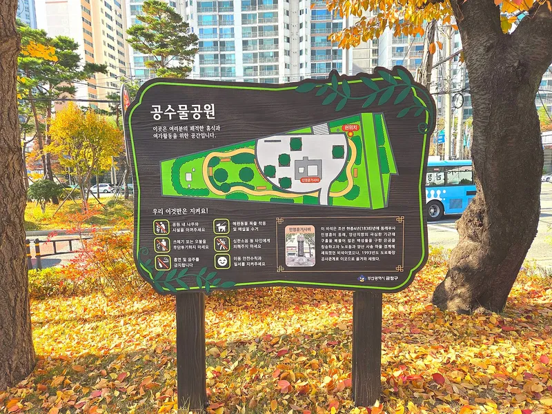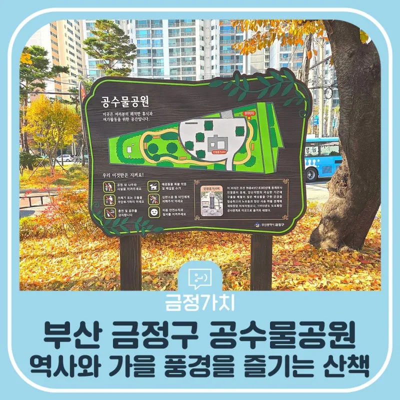 안녕하세요. 공수물공원은 잘 정비된 산책로와 휴식 공간이 곳곳에 있어 가볍게 걸으며 여유를 즐기기 좋았고, 가을철에는 은행잎이 흩날려 한층 운치 있는 풍경을 만끽할 수 있었습니다. 또한 장상만 조각연구소의 ‘번영’ 작품과 동래부사 민영훈공 거사비 등 역사와 지역 문화를 함께 느낄 수 있어 산책 이상의 의미 있는 시간을 보낼 수 있었습니다.
