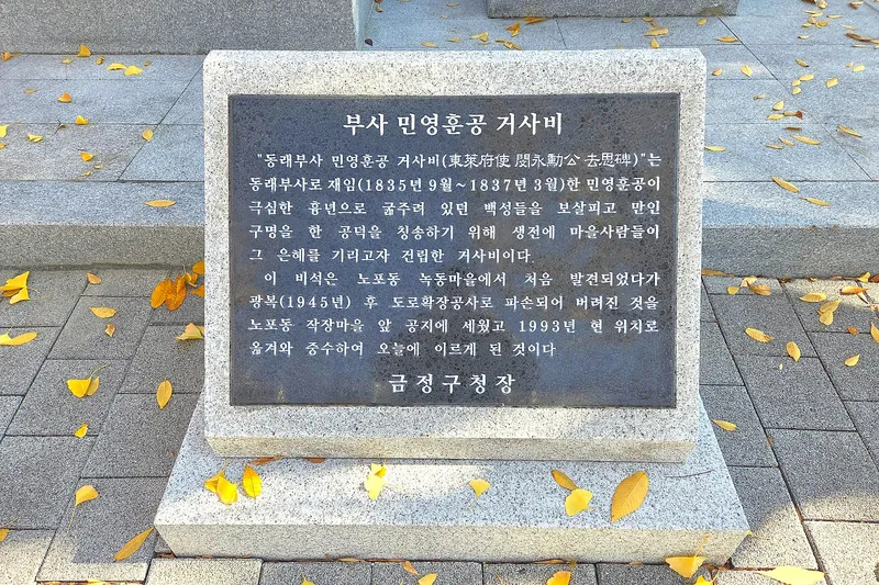‘동래부사 민영훈공 거사비’는 동래부사로 재임하면서 극심한 흉년으로 굶주린 백성들을 보살피고 많은 생명을 구한 민영훈공의 공덕을 기리기 위해 마을 사람들이 세운 기념비입니다. 원래 노포동 녹동마을에서 발견되었으나 1945년 광복 이후 도로 확장 공사로 파손되자 노포동 작장마을 앞 공지로 옮겨 세웠고, 1993년 현재 위치로 다시 중수하였습니다.