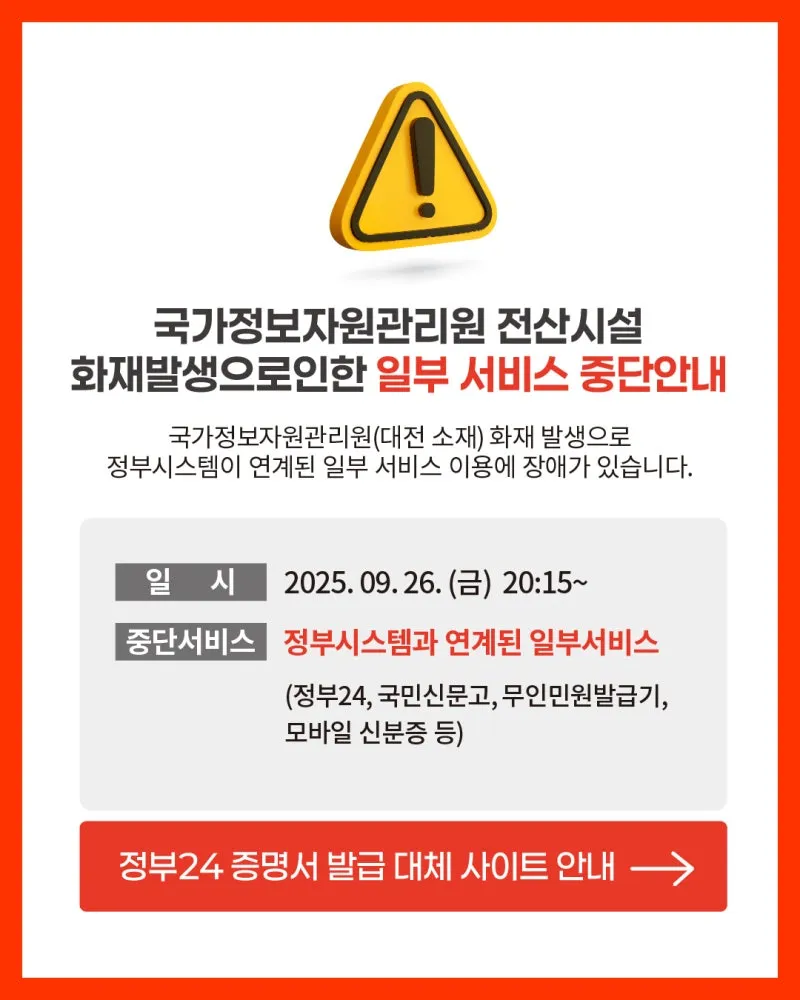 2025년 9월 26일(금) 저녁 8시 15분경, 대전 소재 국가정보자원관리원 전산시설에서 화재가 발생하였습니다.