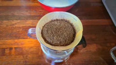 처음에 로스팅된 커피 원두를 필터에 담습니다.