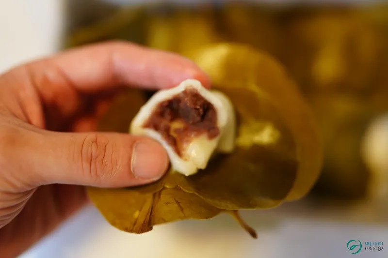 직접 만든 팥소를 넣어 망개잎에 싸서 완성됩니다.