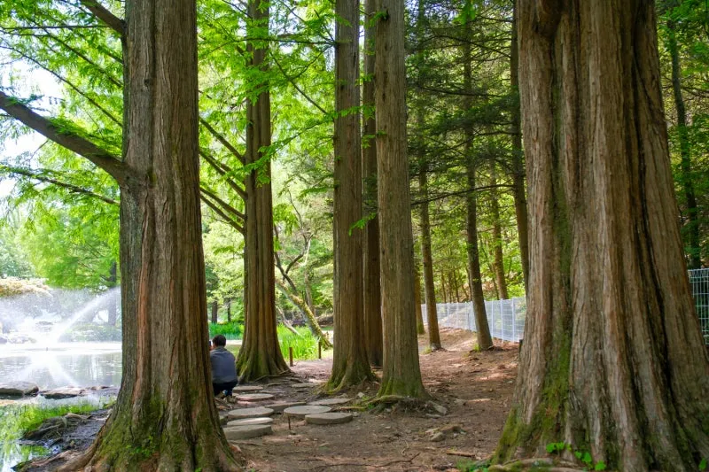 아주 큰 키의 메타세쿼이아 나무들이 어울려