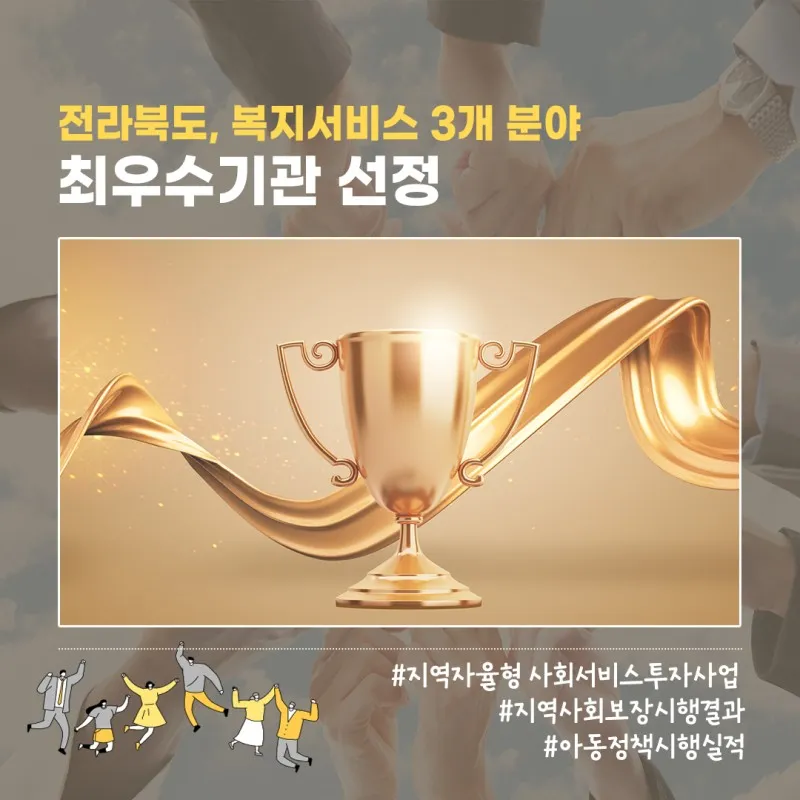 전라북도는 ‘지역자율형 사회서비스투자사업’ ‘지역사회보장시행결과’ ‘아동정책시행실적’ 3개 부분 모두에서 최우수상을 수상하는 성과를 달성했습니다.
