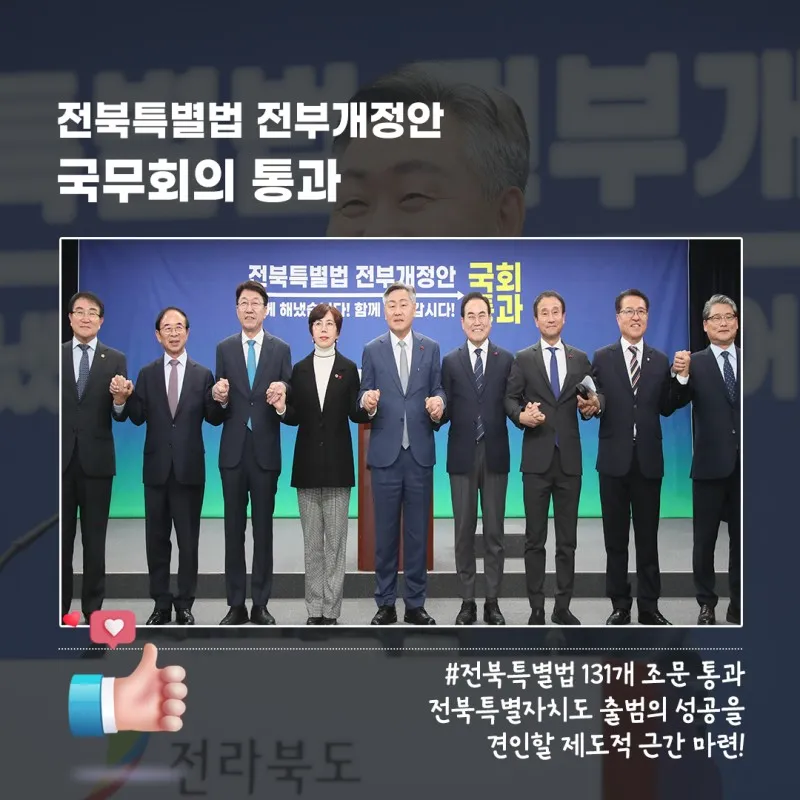전북특별자치도의 출범을 뒷받침할 전북특별법 전부개정안이 국무회의를 통과했습니다. 지난 19일 대통령 주재 국무회의에서 전북특별자치도의 역할을 수행할 수 있는 권한 이양 특례 부여 등 131개의 조문이 담긴 전북특별법 전부개정안에 대한 안건을 의결함에 따라 다음 주 대통령의 특별법 공포 후 개정 절차가 모두 마무리될 예정인데요.