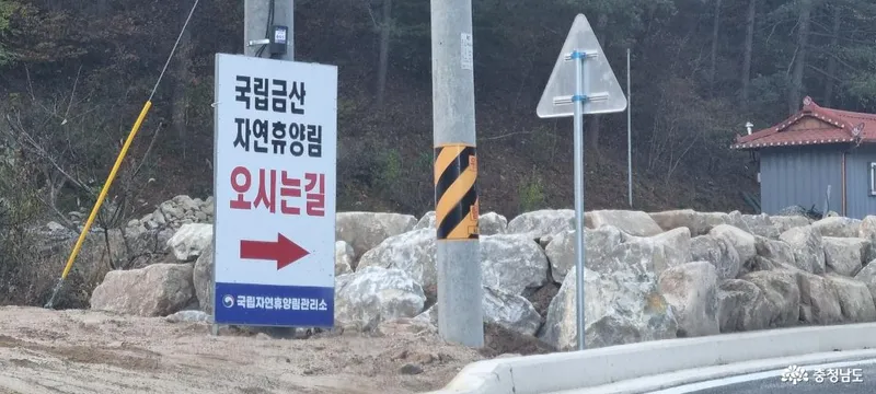 네비게이션을 따라 길을 가다가 금산휴양림을 안내하는 신작로를 만났다. 금산의 새로운 명소를 안내하는 신작로가 반가웠다. 다른 지역의 자연휴양림은 좁은 숲길을 운전하는 애로사항이 있는데 금산자연휴양림은 이용객의 안전과 편의를 위해 신작로를 닦았다.