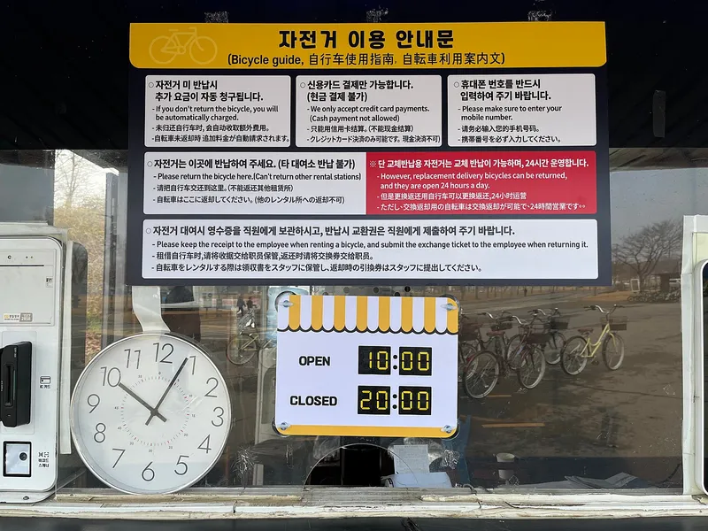 자전거 대여점은 오전 10:00~20:00에 운영하니 운영 시간 참고해서 이용해 보세요.