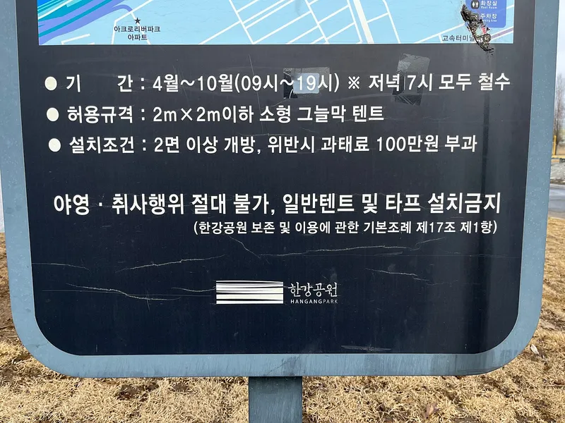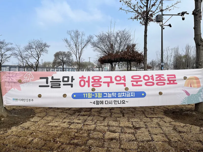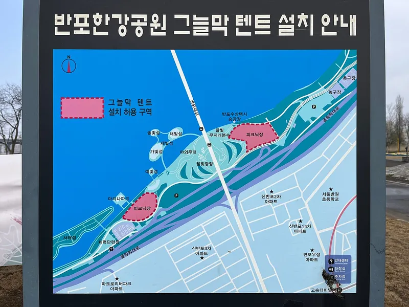 반포한강공원에는 그늘막 텐트 허용 구간이 두 곳 있는데요. 11월부터 3월까지는 설치 금지이고 4월부터 다시 그늘막 텐트가 허용돼요. 이제 반포한강공원에서 피크닉 즐길 시간이 다가오고 있습니다.