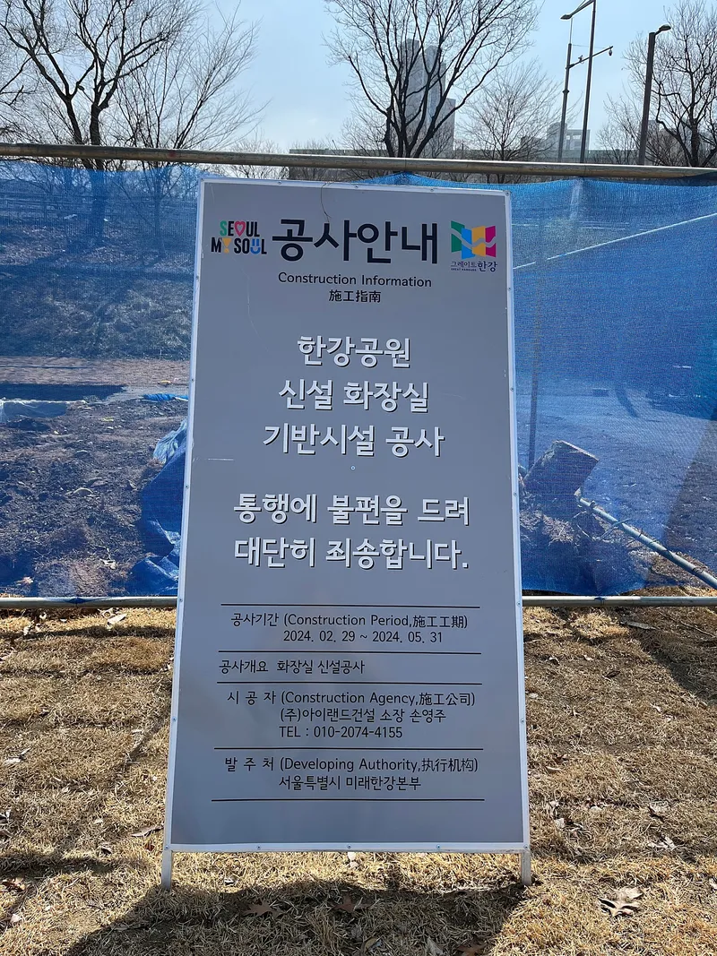 이번에 방문했을 때 유난히 공사 중인 곳들이 많아서 자세히 살펴보았는데요. 현재 화장실 공사가 진행 중이고 새로 지어진 매점은 신규 운영자를 모집 중이었어요. 모두 5월까지 완료한다고 하니 앞으로 더 편리해질 한강공원을 기대해 봐도 좋을 것 같습니다.
