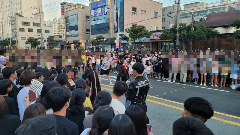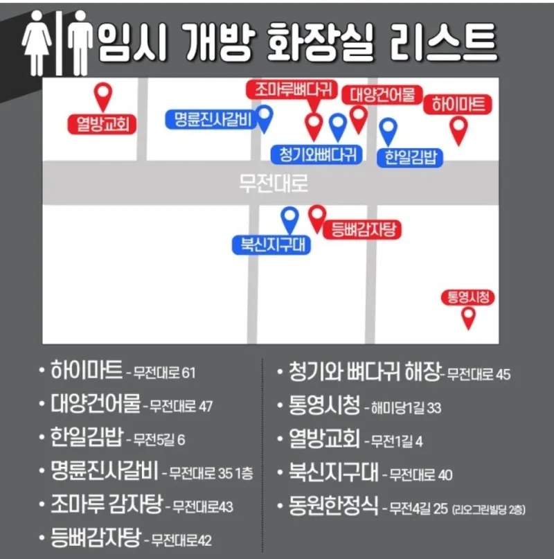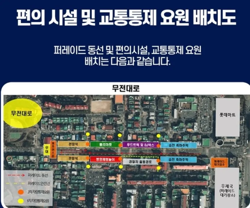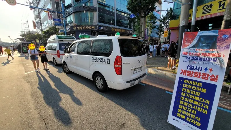 축제장 곳곳에는 임시 개방 화장실 안내 표지판과 함께 급한 볼일을 보도록 안내하고 있습니다. 또한, 안전요원들이 우리를 지키고 있습니다.